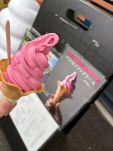 園内ではバラのソフトクリームといったフードも販売していました。ドライバーさんたちもそのお子様たちも、多くの人がソフトクリームを堪能していましたよ!